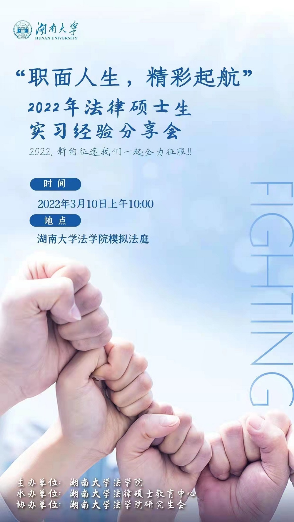 2022年3月10日上午10:00,伟德国际1949始于英国将在模拟法庭举办“职面人生,精彩起航”——2022年法律硕士生实习经验分享会。届时,将邀请参与国家法官学院、行政机关、律所、公司法务四大板块的优秀实习生作为分享嘉宾与同学们进行经验交流,了解各色法律职场。