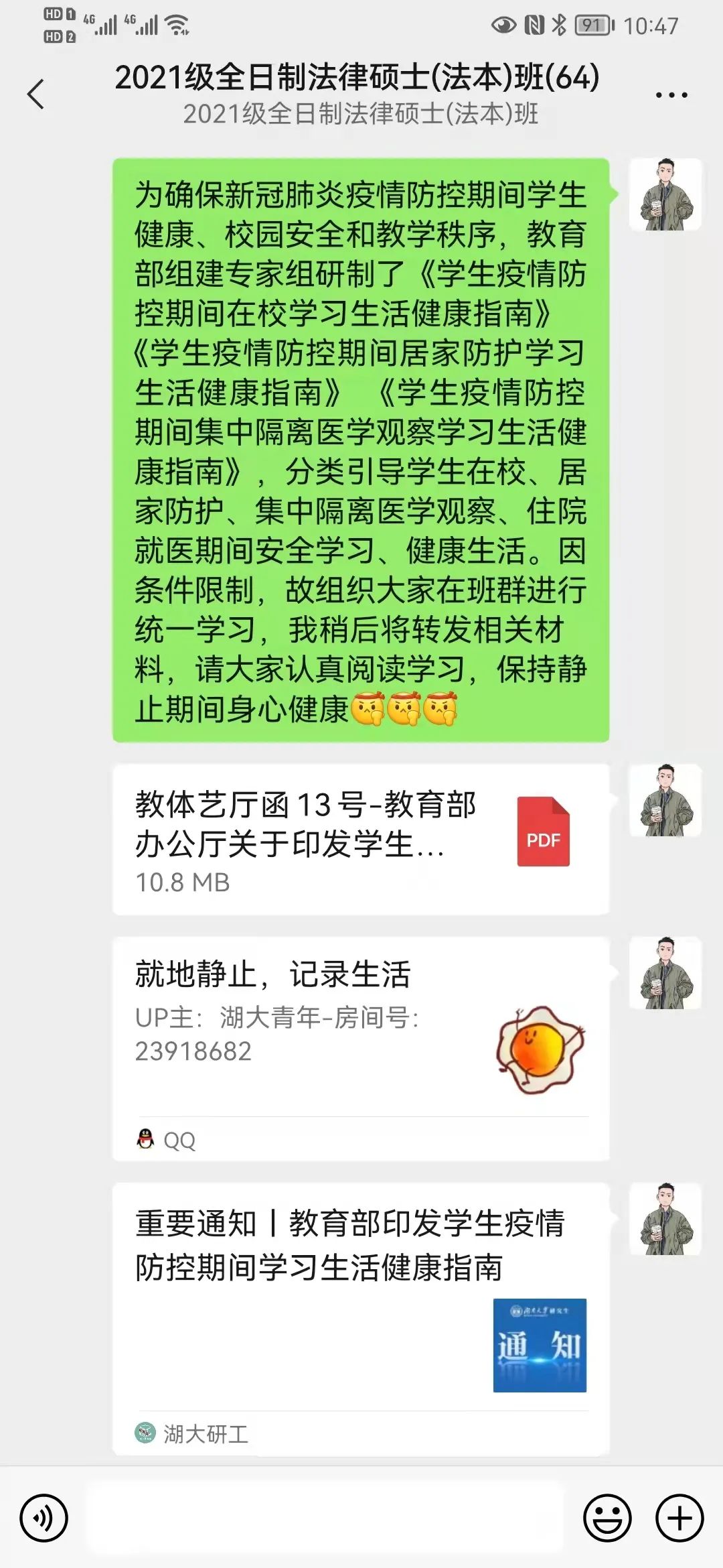 周六晚上我们班级召开了腾讯线上会议,组织班里同学们集体学习教育部的三份新冠肺炎疫情防控指南文件,旨在分类引导学生在校、居家防护、集中隔离医学观察的安全学习、健康生活。现阶段湖大处于管控区,绝大多数学生都是在校。日常生活学习,应当保持安全的社交距离,遵守出入校门的规定,坚持去戴口罩排队食堂打饭,自觉配合核酸检测,宿舍通风不串门,主动接种新冠病毒疫苗加强针,在学校要求的线上网课按时完成学习任务,保持充足睡眠,坚持科学锻炼身体,养成健康生活好方式等。