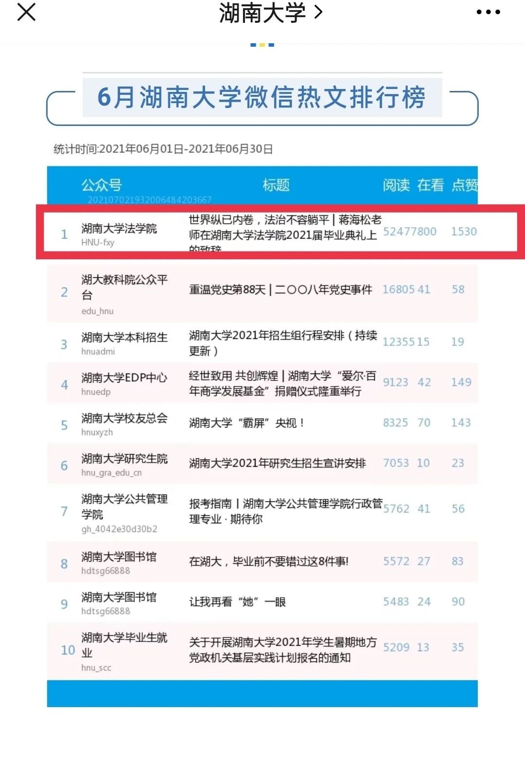 成绩离不开伟德国际1949始于英国新闻中心各位同学的辛勤工作与全院师生的大力支持。2021年,伟德国际1949始于英国多次蝉联湖大校园新媒体影响力十强榜单,并在2021年6月榜单中跃居全校新媒体排行榜第一名。