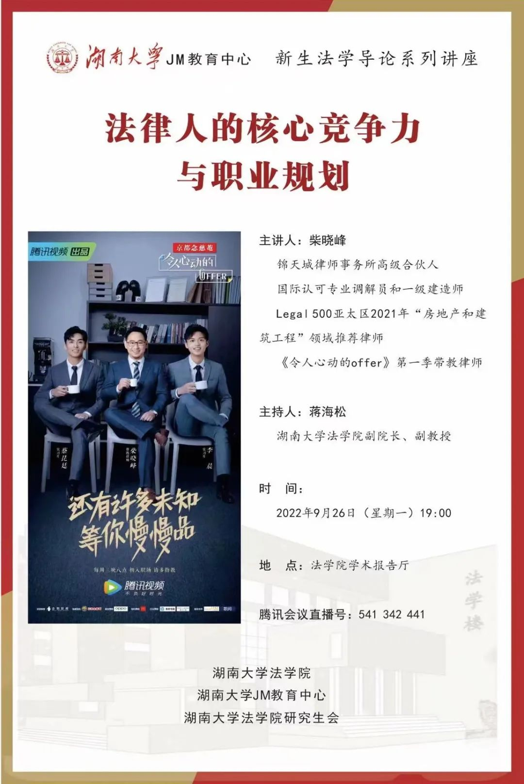 法学之道路,漫漫且修远。要推开法律之门,则必须要进行长久的积淀、萃取、锻造、磨砺。在新生“法学导论“系列活动讲座中聆听大家之言,让老师们一句句睿智的话语引领着我们扬起知识的风帆。而在今年,我们有幸邀请了”令人心动的offer“中的带教律师”柴晓峰“律师来为同学们带来”法律人的核心竞争力和职业规划“的讲话,让我们受益匪浅。