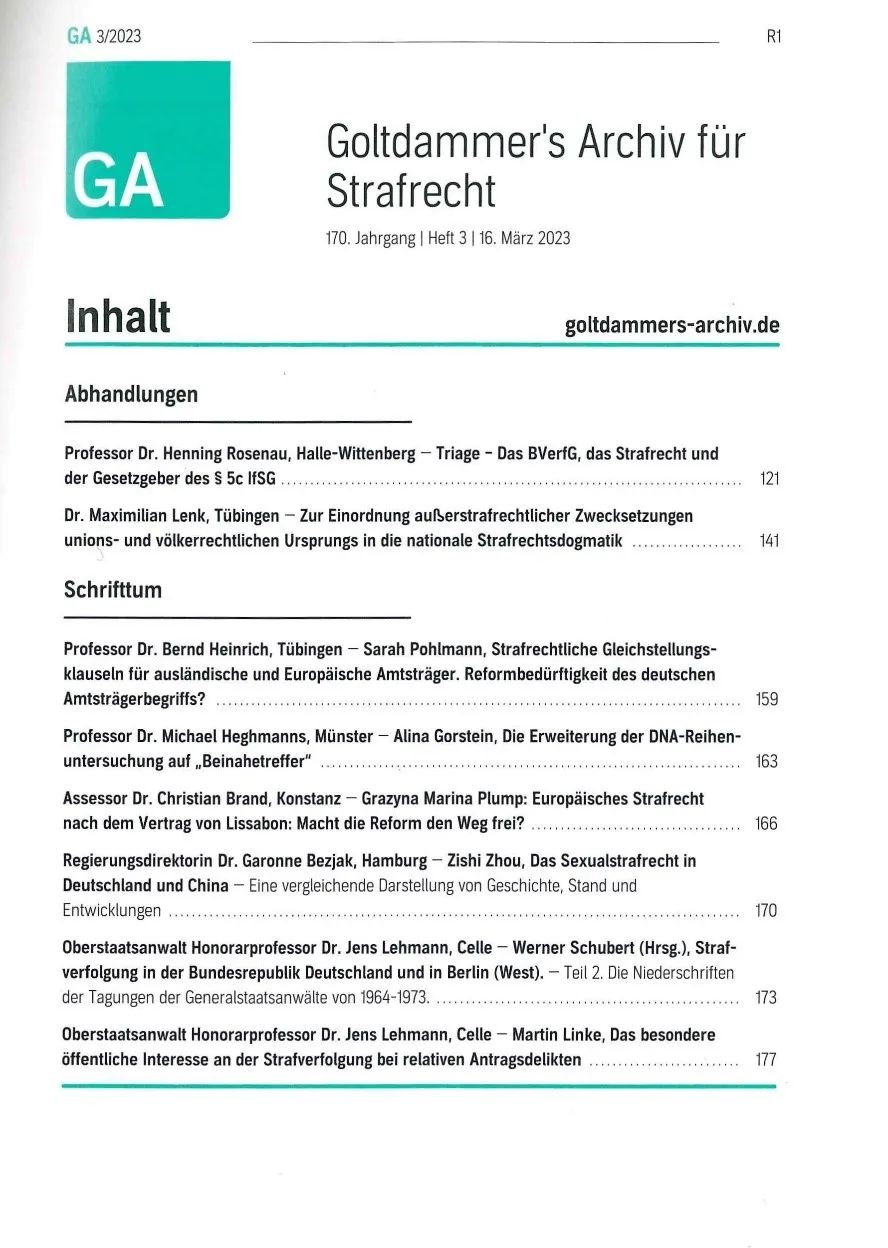我们周子实老师于2020年出版的德文专著《德国与中国的性犯罪刑法——历史、现状和发展的比较性阐释》(Das Sexualstrafrecht in Deutschland und China — Eine vergleichende Darstellung von Geschichte, Stand und Entwicklungen)被德国学者Garonne Bezjak博士写成书评,发表于最新一期(2023年第3期)的德国刑事法顶级期刊《戈尔特达默刑法档案》(Goltdammer's Archiv für Strafrecht)。