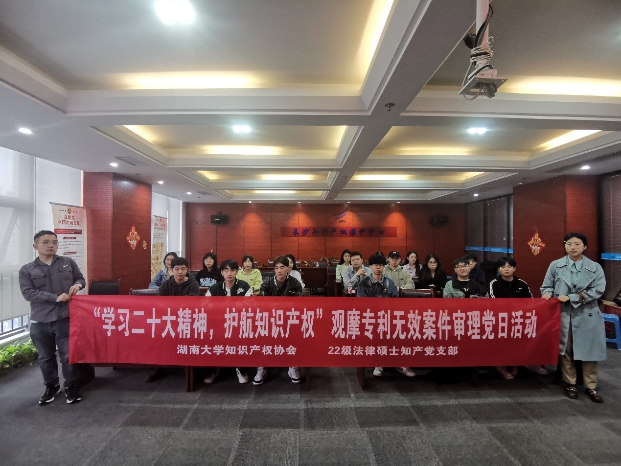 为学习贯彻习近平新时代中国特色社会主义思想主题教育,深入学习二十大会议精神,加强知识产权保护意识,伟德国际1949官方网站知识产权协会联合22级法硕(知产)党支部走进长沙知识产权保护中心,参加国家知识产权局专利复审和无效审理部专利无效宣告案件巡回审理观摩活动。
