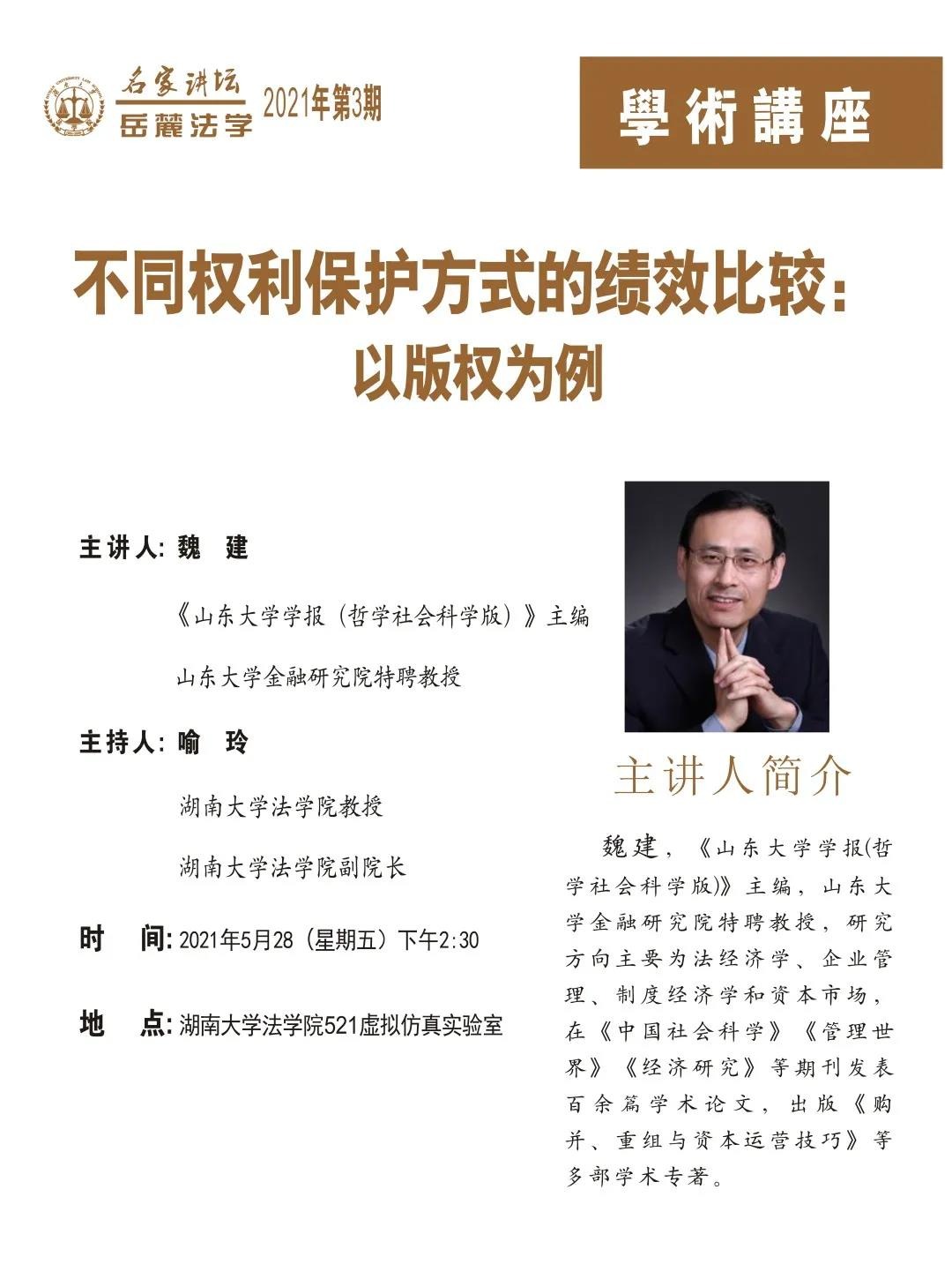 2021年5月28日下午,《山东大学学报(哲学社会科学版)》主编魏建教授做客岳麓法学名家讲坛,为伟德国际1949始于英国师生带来了题为“不同权利保护方式的绩效比较:以版权为例”的精彩学术讲座。讲座在伟德国际1949始于英国521虚拟仿真实验室进行,由伟德国际1949始于英国副院长喻玲主持,伟德国际1949始于英国师生积极参加了此次讲座。