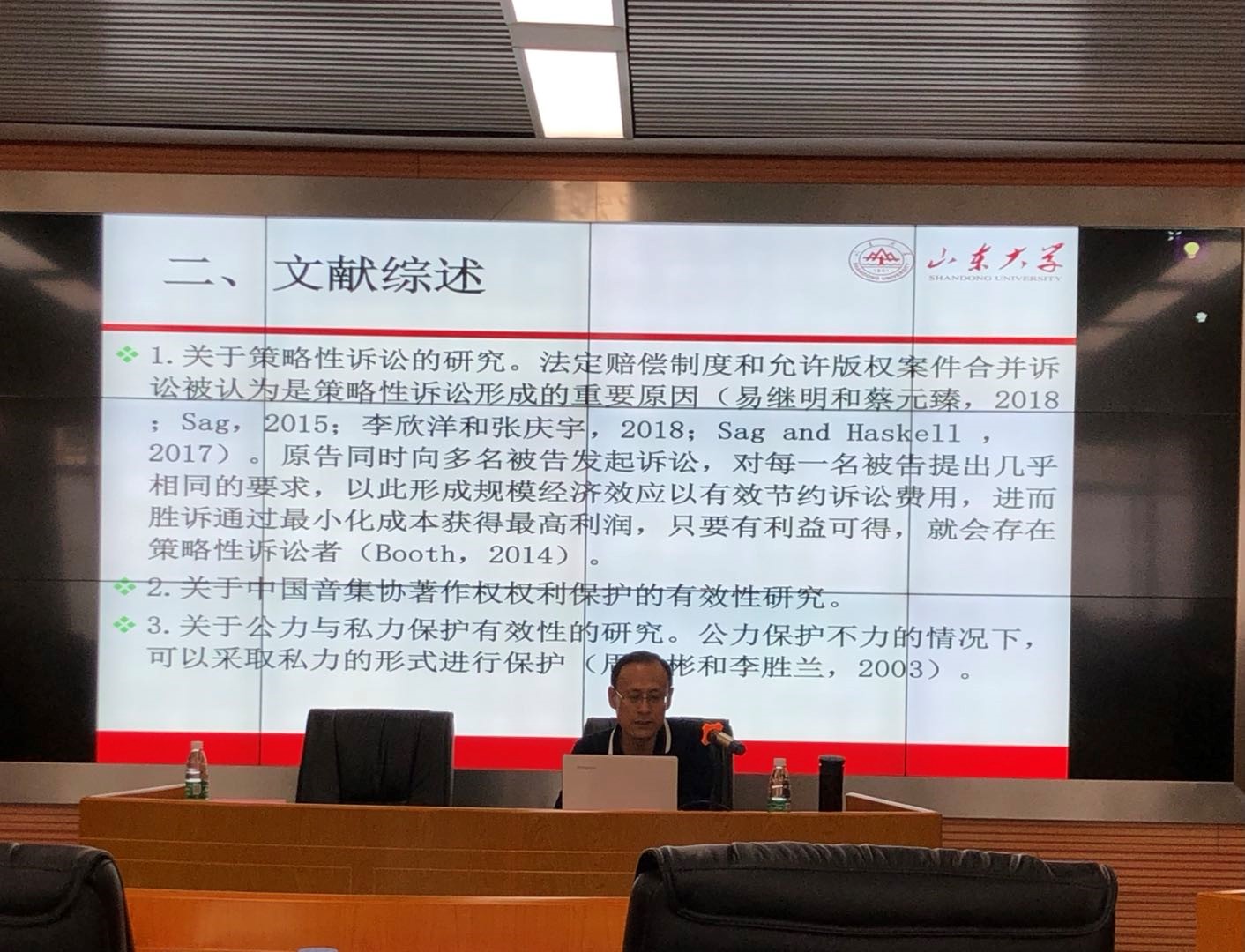 讲座伊始,魏建教授以版权法为切入点,对版权保护的不同方式展开论述。首先,他从理论上对策略性诉讼、中国音集协著作权权利保护的有效性、公力与私力保护有效性三方面对我国有关权利保护的研究现状进行初步介绍,他认为从权利保护的角度而言,策略性诉讼者、中国音集协都是重复诉讼者,都更高地完成了对著作权的保护,有效地遏制了侵权。同时,魏教授指出,还需要从经验事实上对中国音集协的代理保护、策略性诉讼者的行为特征以及自我保护上加深对版权保护的理解。