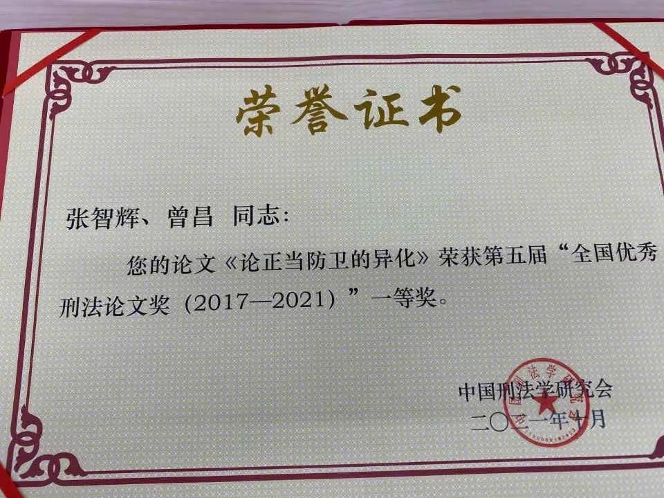 颁奖仪式由黄京平教授主持,曲新久教授宣读优秀刑法论文以及优秀著作获奖名单。从五年897篇刑法论文中共评出一等奖10篇、二等奖15篇、三等奖25篇。我们张智辉教授、曾昌博士研究生合著《论正当防卫的异化》一文被评为第五届全国优秀刑法论文奖(2017-2021)一等奖,我们赵香如副教授论文《论总体国家安全观下刑法的基本立场》被评为二等奖,体现了我们刑法学科强劲的影响力。