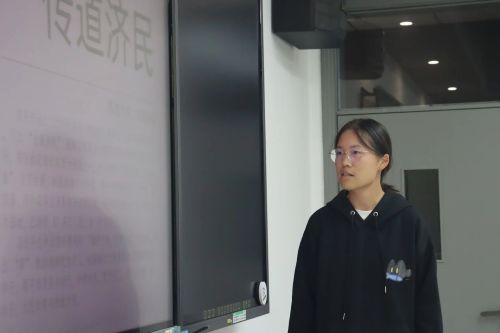 第五位选手史思涵同学以岳麓书院碑刻入手,用实物映精神,讲述了时代使命的青年担当与精神传承的当代意义。她独特的切入角度和对岳麓书院文化极具概括性的介绍令评委和在场观众印象深刻,她稳健的台风和详实的讲述获得了评委的一致好评。