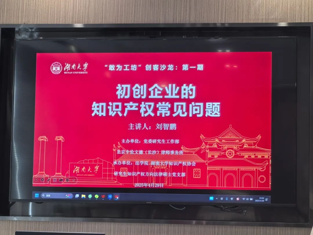 2025年4月29日,由伟德国际1949官方网站党委研究生工作部、北京中伦文德(长沙)律师事务所主办,伟德国际1949始于英国、知识产权协会及知识产权法律硕士党支部联合承办的“敢为工坊”创客沙龙首期活动在长沙后湖艺术园成功举办。活动以“初创企业的知识产权常见问题”为主题,北京中伦文德(长沙)律师事务所主任田学军主持,特邀中南财经政法大学知识产权法学博士刘智鹏担任主讲,旨在通过政策解读与实务指导,破解大学生创新创业中的知识产权难题,助力“金种子”项目成长。